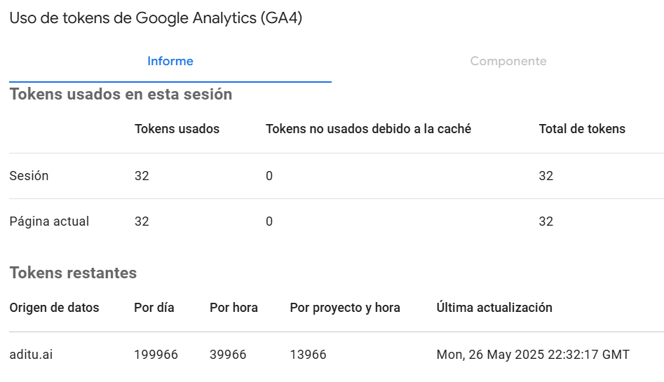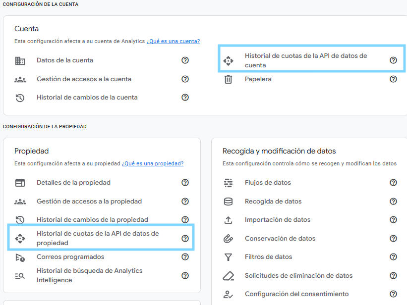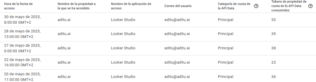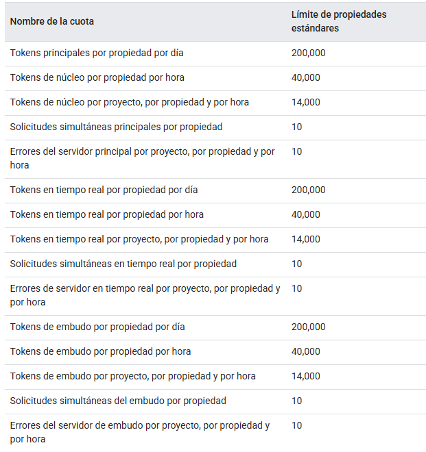 Aquí podremos encontrar el consumo de tokens de la API de Google Analytics tanto a nivel de cuenta como de propiedad.