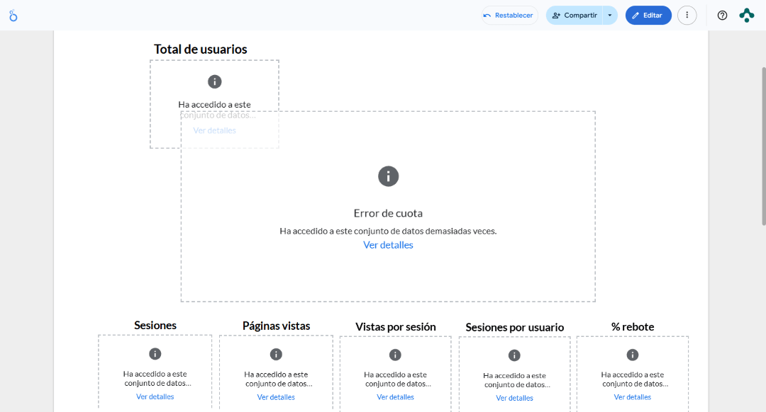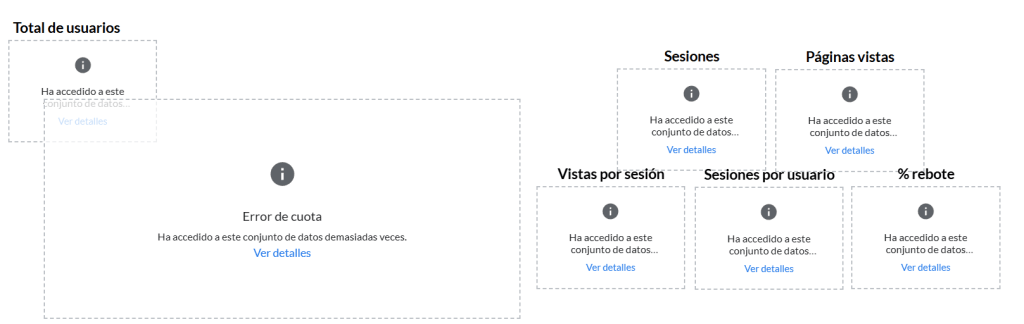 De hecho, eso es justo lo que nos aparecerá en la interfaz de Looker Studio en el momento que hayamos rebasado ese límite que comentábamos, más concretamente, lo que sucederá es que desaparecerán todos nuestros gráficos que usen como fuente Google Analytics y en su lugar nos saldrá dentro de cada recuadro un mensaje de error que dice “Ha accedido a este conjunto de datos demasiadas veces”.