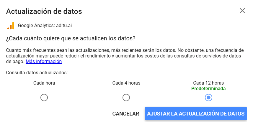 Aunque el plazo por defecto sean 12 horas, es bastante común ver que se han seleccionado frecuencias más bajas para conseguir datos más frescos sin tener en cuenta que esta práctica puede provocar problemas como la ralentización de la carga o incluso un error de cuota. Así que, si queréis revisar o cambiar vuestra configuración de frecuencia de datos, seguid estos pasos: