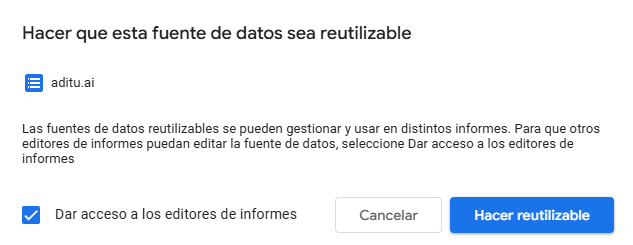 Otra de las opciones es, siempre que sea posible, buscar reutilizar los distintos elementos. Aquí nos referimos sobre todo a las fuentes de datos, las cuales podemos marcar manualmente como reutilizables para que se puedan usar en varios informes y así no tener que cargar una distinta para cada cuadro de mando.