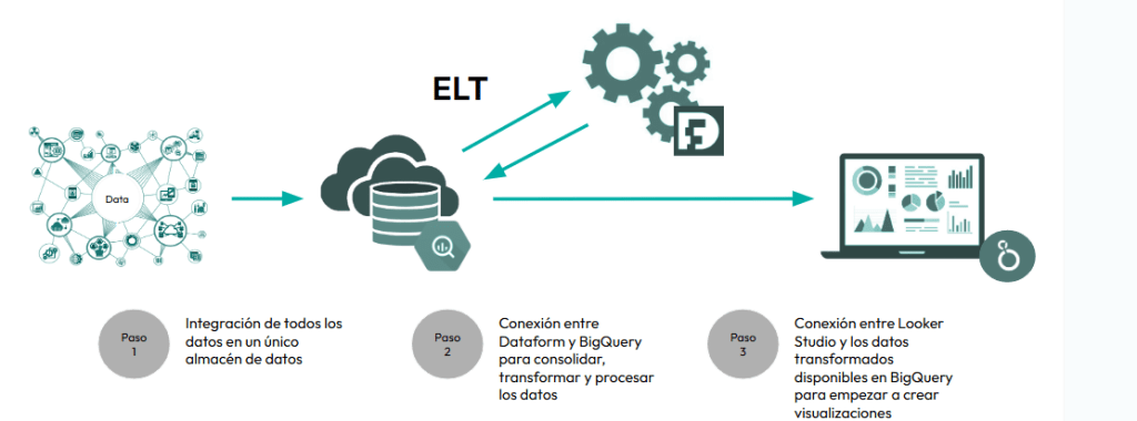 Después, esos datos se transforman para unificarlos y darles un formato que Looker Studio pueda procesar correctamente. Avisamos de que este es el paso más complicado y que más trabajo técnico requiere, pero es también fundamental para que Looker Studio pueda entender correctamente la información.
