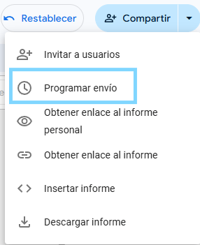 De forma complementaria a la medida anterior podemos optar por, en lugar de consultar los dashboards directamente desde Looker Studio, automatizar el envío de informes periódicos por correo electrónico.