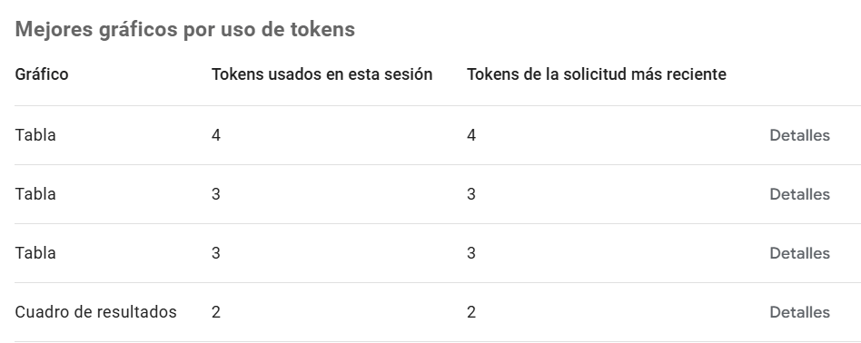 Acto seguido se nos abrirá un informe bastante completo donde no solo podremos ver los tokens gastados, sino también los tokens disponibles (por hora, por día y por proyecto), un ranking de los mejores gráficos según su consumo de tokens y un informe específico por cada uno de los componentes del dashboard.