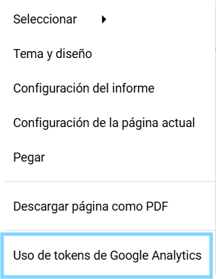 La primera alternativa es verlo directamente en Looker Studio. Para ello solo hay que entrar en Looker Studio y clicar con el botón derecho bien en la propia página o bien sobre un gráfico o filtro. Ahí se nos abrirá un cuadro donde tendremos, entre otras opciones, Uso de tokens de Google Analytics.