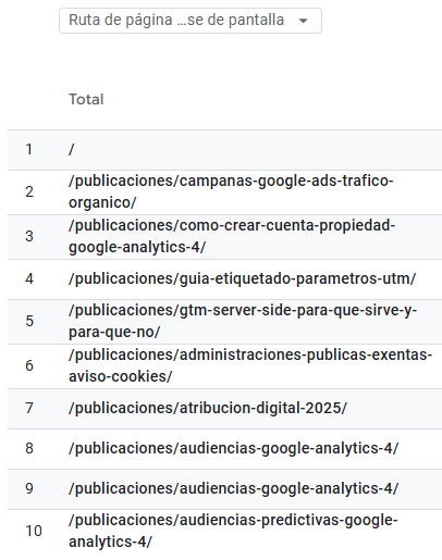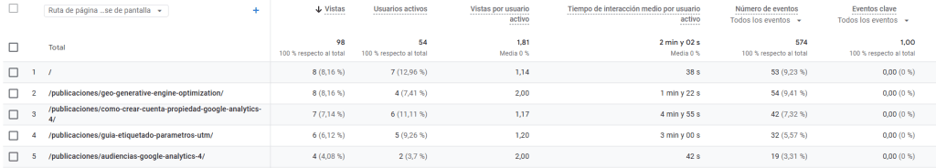 Por suerte, dentro del mismo informe y con el mismo filtro que estábamos antes, Interacción > Páginas y pantallas + filtro por fuente/medio de IA, podemos saber si nuestro contenido ha conseguido enganchar a los usuarios, o incluso tratar de deducir qué buscaban en nuestra web.