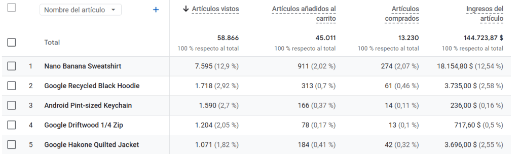 Una vez más, esto se puede extraer, más o menos fácilmente, en Google Analytics, más específicamente en el informe de Monetización > Compras en comercio electrónico.