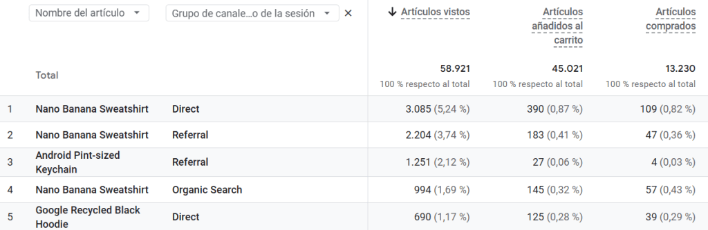 Esto proporciona información clave acerca del rendimiento del ecommerce según el canal y la eficacia y eficiencia que tiene la IA para conseguir que los usuarios compren.