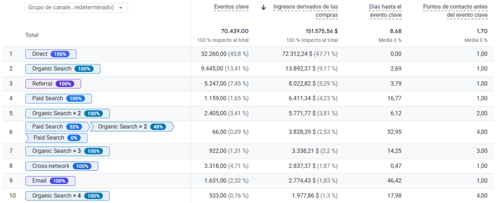Como podéis ver en la imagen de arriba, este informe proporciona información sobre los canales con los que ha entrado en contacto el usuario antes de convertir, así como cuántas veces ha necesitado interactuar con la marca, cuántos días ha tardado en tomar la decisión o en qué medida ha contribuido cada canal para conseguir que se produzca ese evento clave.